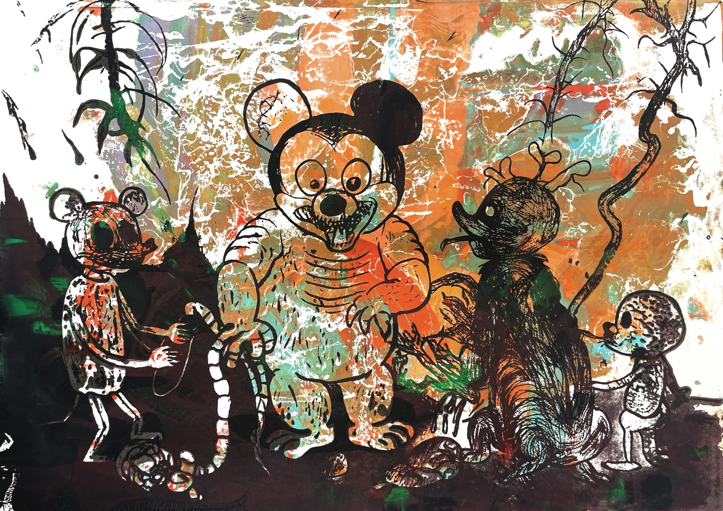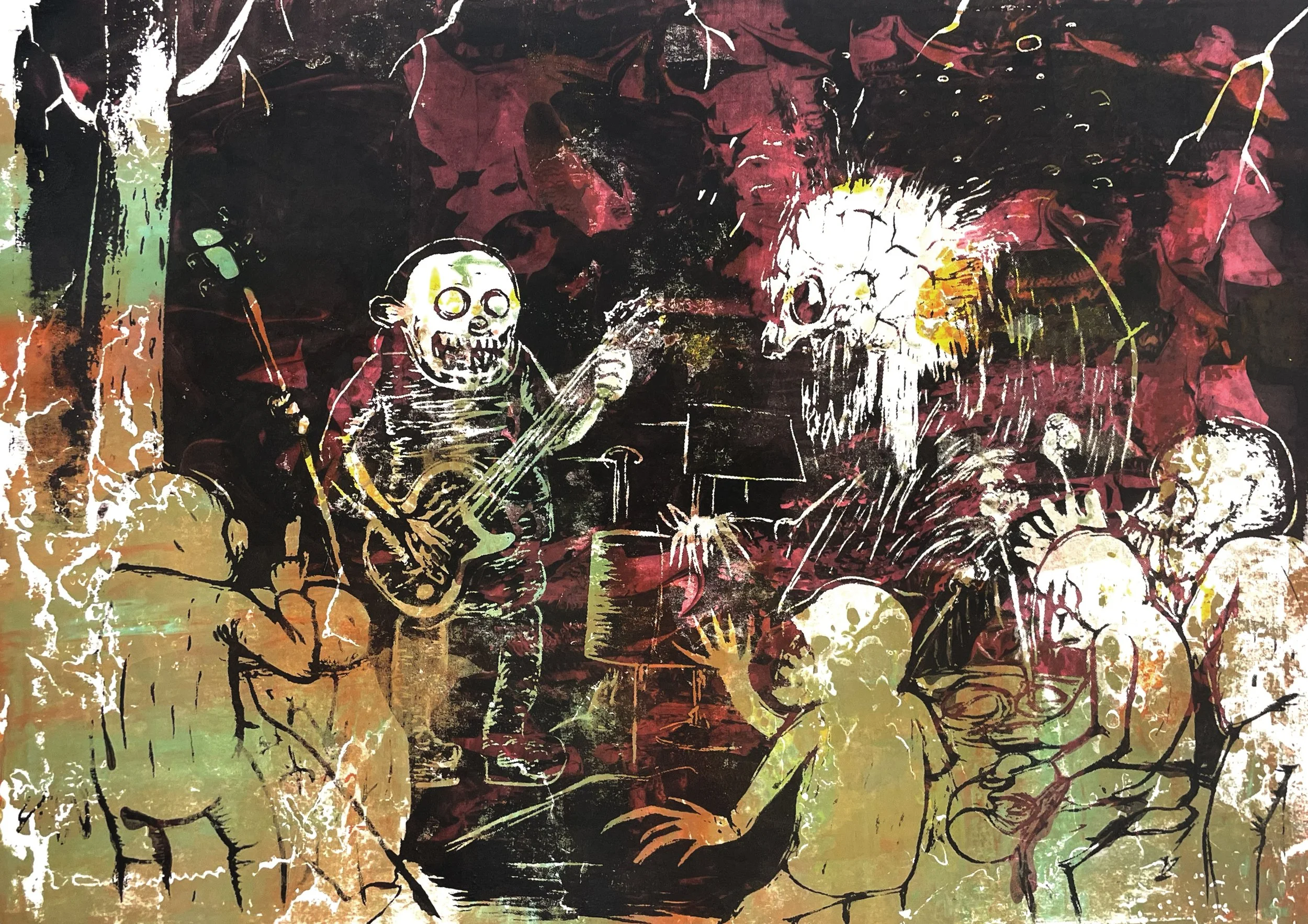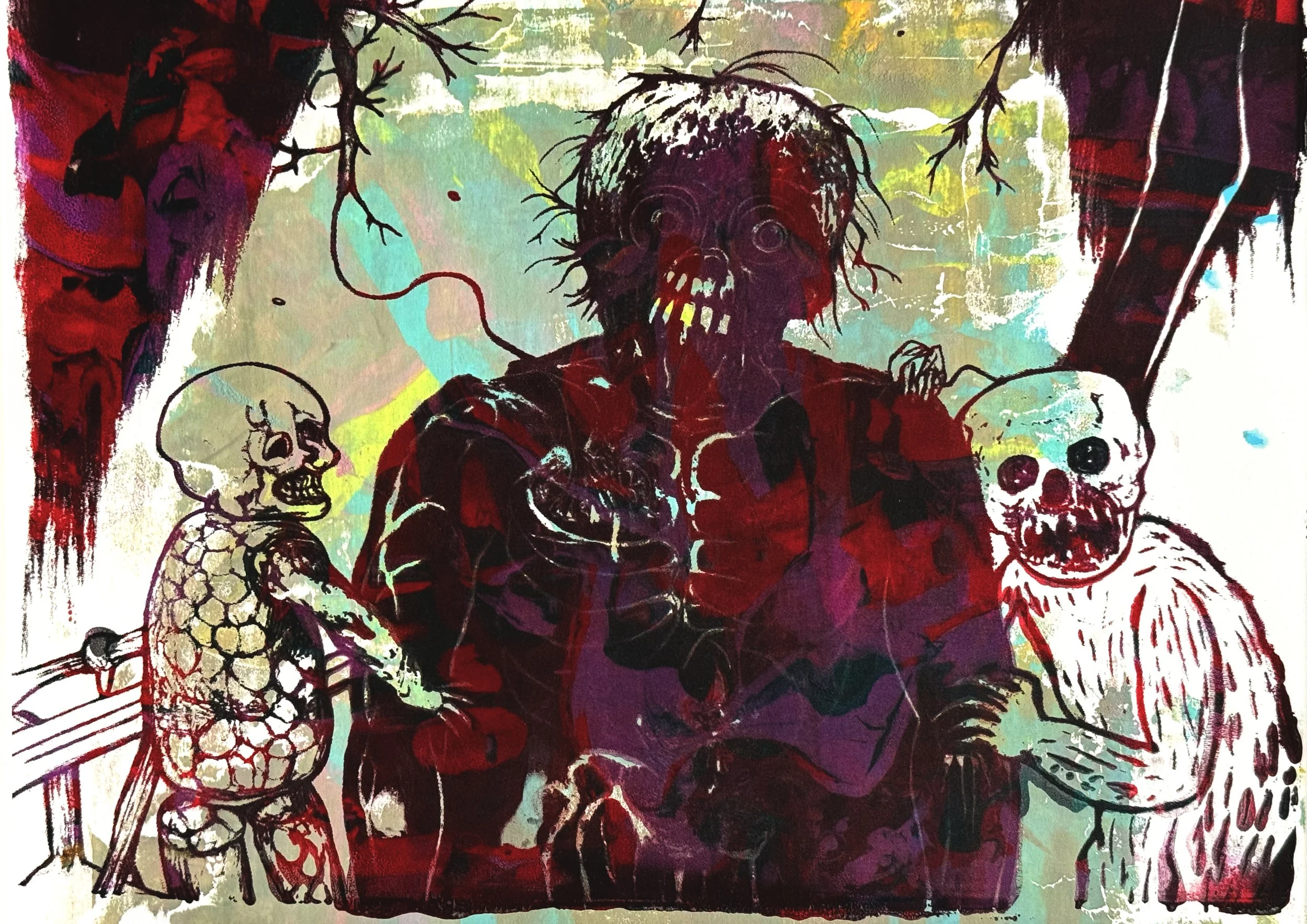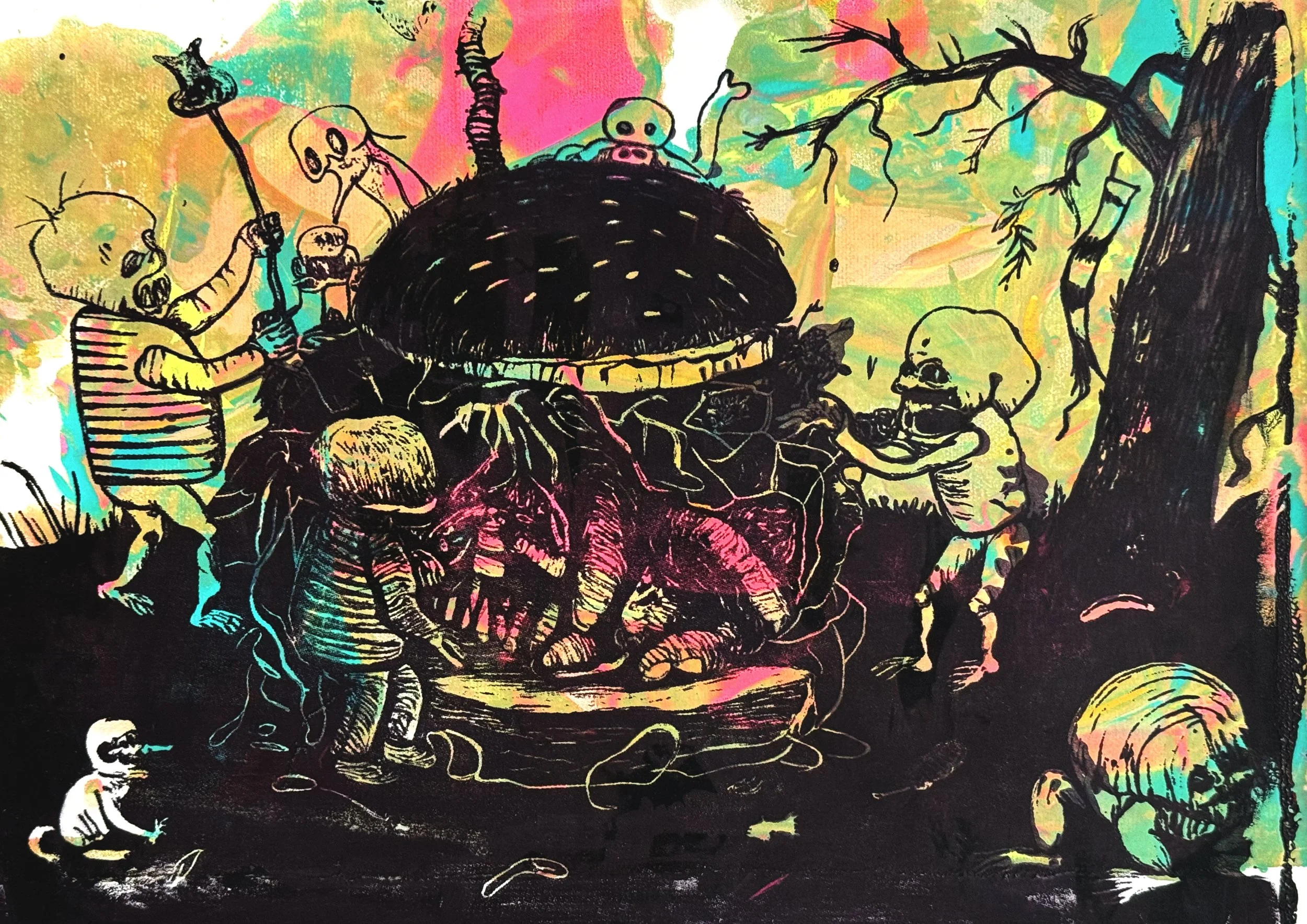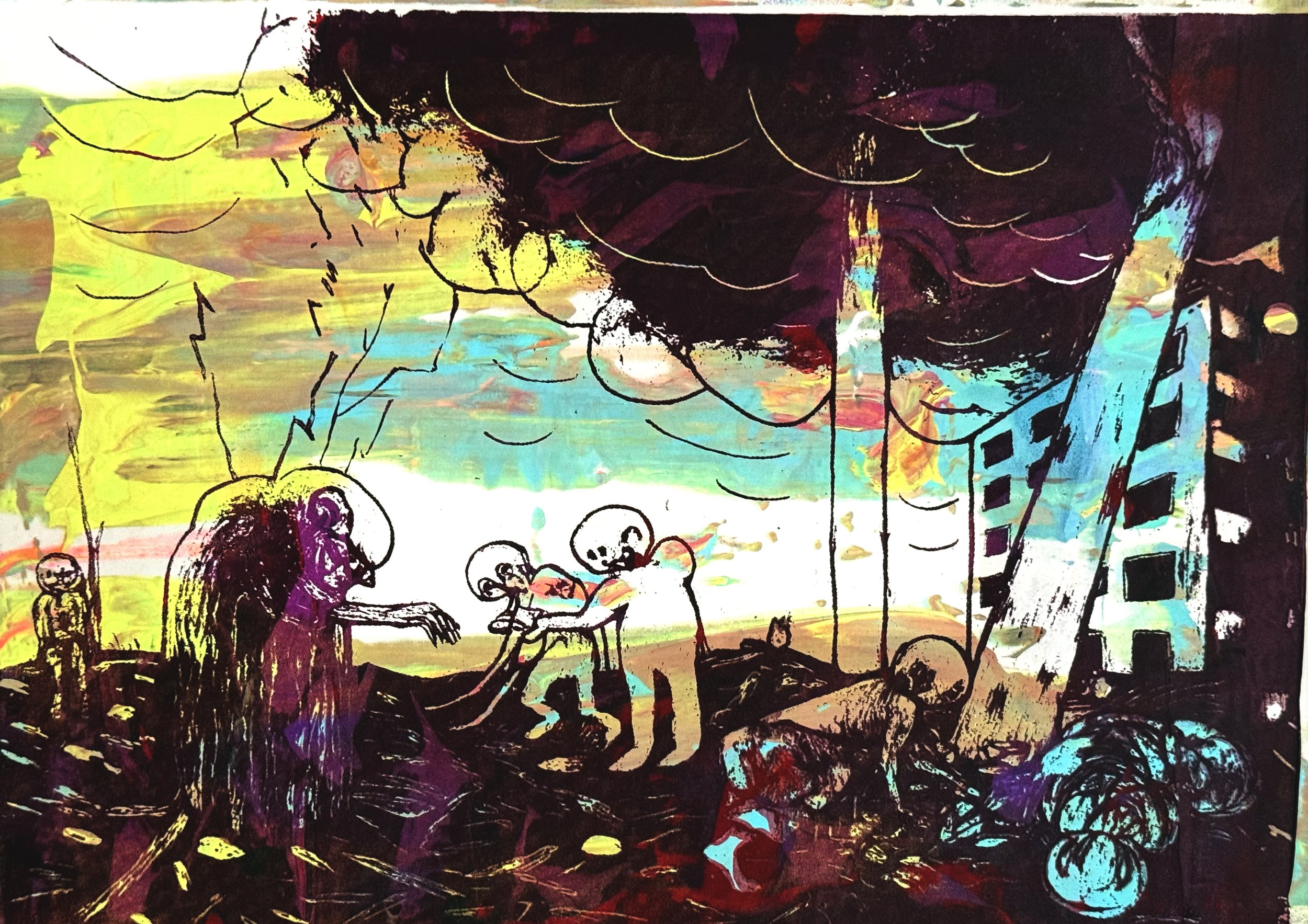 In the blink of an eye, the joyful images of childhood here transform into instruments of bitterness and disappointment, evolving into a dozen symbols of unfulfilled hopes. These colors flow across the canvas like dark arteries, carrying the poison of past futile aspirations, akin to bloody storms raging in the depths of our unmet desires. Looking at this multitude, it is impossible not to feel how dreams of the unrealized intertwine with the sharpness of loss, creating a resounding void where promised happiness once resided.